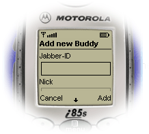 Add a new Buddy Type in the Jabber-ID of your friend and the nick you wish to see on your buddy list. Then confirm pressing "Add". The contact will be added to your buddy list.